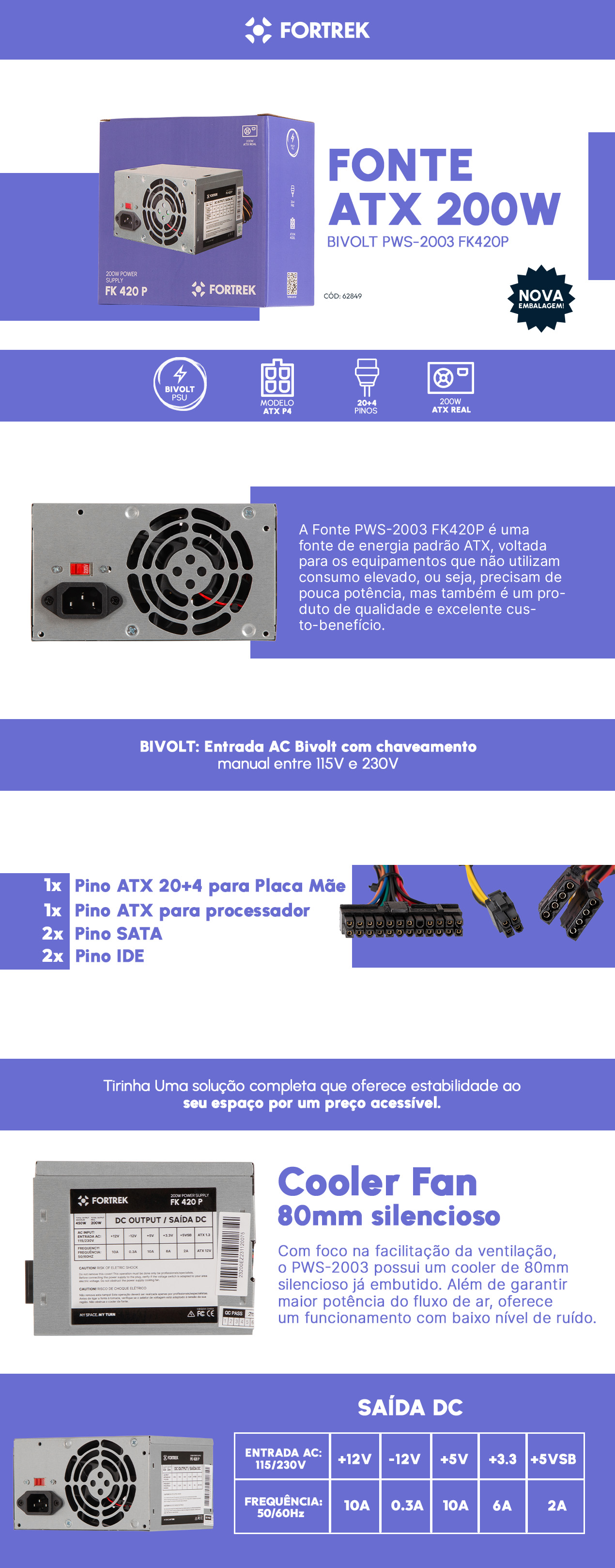 • Proteção: OVP (Over Voltage Protection), UVP (Under Voltage Protection), SCP (Short Circuit Protection), OTP (Over Temperature Protection), OPP (Over Power Protection), OCP (Over Current Protection), e OPP (Over Power Protection)